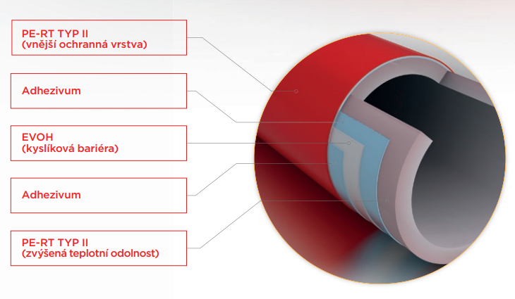 Kvalitní systémové trubky z PE-RT typ II pro podlahové, stěnové nebo stropní vytápění či chlazení, přívody k radiátorům a fancoilům. Pětivrstvá konstrukce - dlouhodobá životnost a dokonalá těsnost kyslíkové bariéry z EVOH. Tmax 95°C.