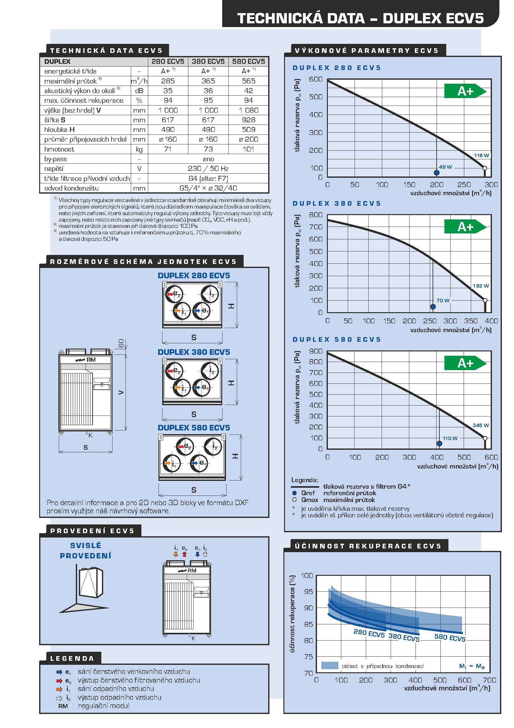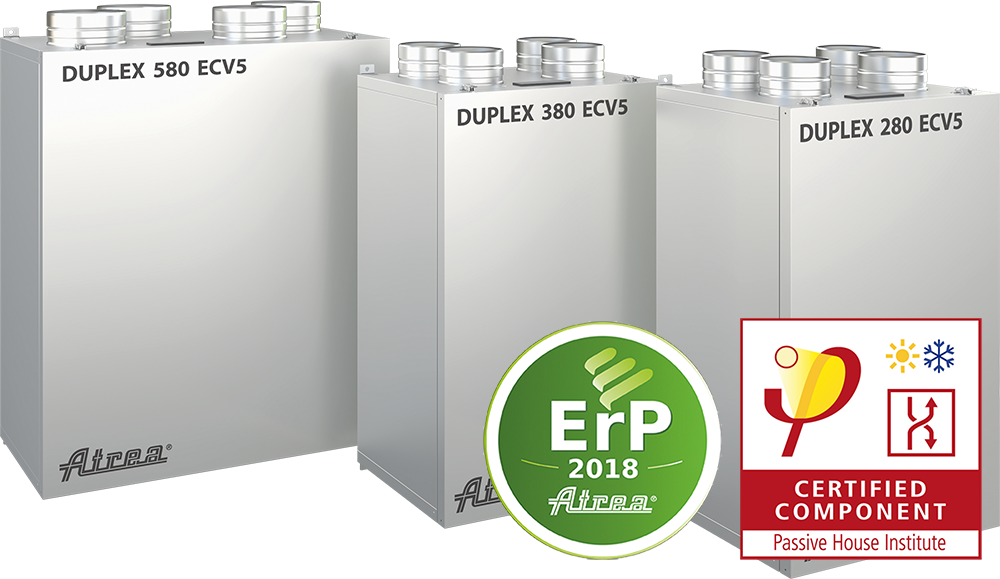 Nová, již pátá generace kompaktní větracích jednotek s rekuperací tepla DUPLEX EC5, ECV5 je stejně jako její předchůdci určena pro komfortní řízené větrání rodinných domů a bytů. Svými parametry jsou zejména vhodné pro rodinné domy s využitím v objektech nízkoenergetických a energeticky pasivních. Velmi vhodné je použití v bytech s decentrálním systémem větrání, nebo pro decentralizované systémy škol, nebo administrativních objektech. Jednotky se dodávají ve dvou základních provedeních – podstropní EC5 a nástěnný ECV5. Jednotky EC5 a ECV5 splňují svými parametry požadavky pro zařízení v nejvyšší energetické třídě A+.