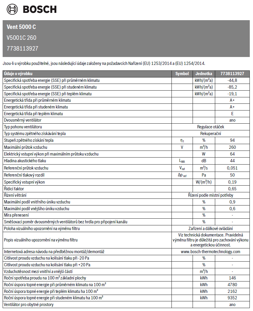 Technické údaje - Rekuperace Bosch 5001C 260