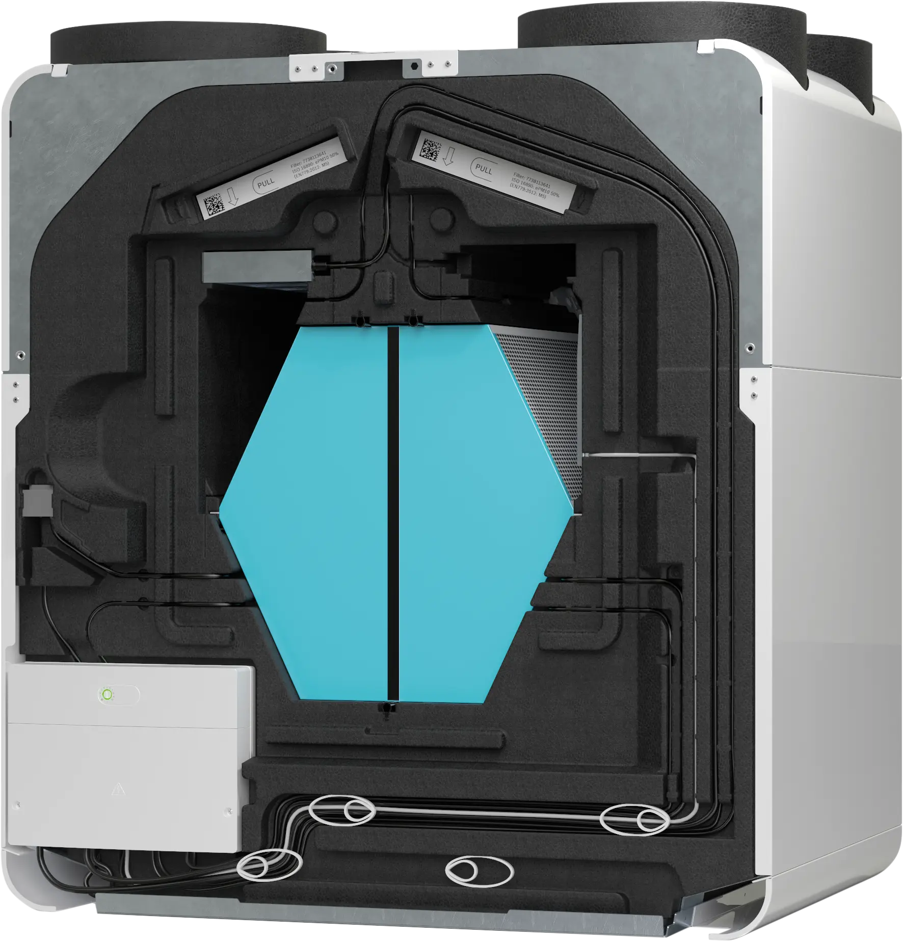 Díky snímači pro měření teploty a vlhkosti integrovanému z výroby je výměna vzduchu automaticky regulována a ventilační jednotka pracuje stále velice efektivně.
