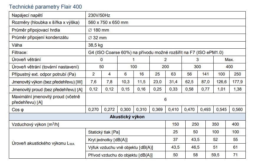 Rekuperace Brink Flair 400 (Shoda s WOLF CWL-2) - Špičkové parametry
