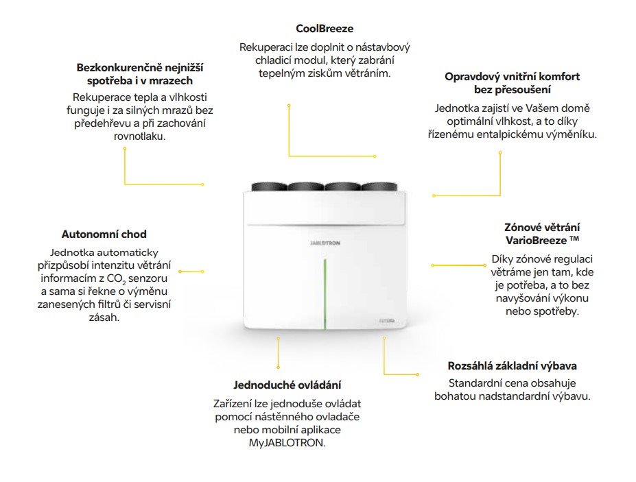Současné novostavby s kvalitně izolovaným obvodovým pláštěm se velmi často potýkají s nadměrnou vlhkostí interiéru, která je způsobena nedostatečným větráním. A právě přílišná vlhkost může negativně ovlivnit nejen stavbu samotnou, ale především Vaše zdraví a vitalitu. Optimálním řešením je řízené větrání s rekuperací. Rekuperační jednotka zabezpečí přirozené větrání Vašeho nového domova; nízkoenergetická novostavba sama o sobě si s větráním neporadí. Při řízeném větrání s rekuperací jde o kontinuální výměnu opotřebovaného vzduchu zevnitř za čerstvý a čistý vzduchzvenku. Přiváděný vzduch získává od vzduchu odváděného převážnou část jeho tepla, je tedy tepelně optimalizován a díky použité filtraci také zbaven prachu, pylu a alergenů. Jednoduše všeho, co byste při větrání okny rádi nechali venku. Větrání obytného prostoru probíhá se zavřenými okny. Otevřít si je samozřejmě můžete, kdykoliv chcete, ale v období, kdy je žádoucí udržovat tepelnou energii uvnitř domu a okna neotvírat, jednoduše nebudete muset. Výkon rekuperační jednotky se automaticky přizpůsobí Vašim požadavkům na kvalitu vnitřního prostředí, a to na základě informací z čidel CO2. Analogie s plíceminení náhodná; rekuperační jednotka tvoří skutečné plíce Vašeho domova. A stejně tak i pracuje. Přirozeně zabezpečuje větrání, abyste vždy dýchali čerstvý vzduch.Na trhu existuje mnoho kvalitních rekuperačních jednotek a Vy máte možnost porovnat je navzájem. Nemáme přehnaná tvrzení, ani jsme nevymysleli perpetuum mobile. Pouze dokonale využíváme zákonů fyziky. A právě díky tomu se naše rekuperační jednotka Jablotron Futura v několika oblastech výrazně odlišuje od ostatních.