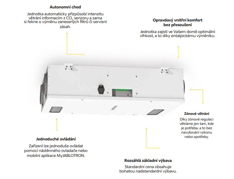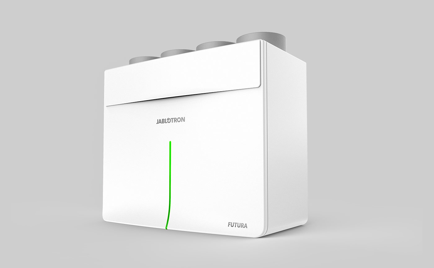 Současné novostavby s kvalitně izolovaným obvodovým pláštěm se velmi často potýkají s nadměrnou vlhkostí interiéru, která je způsobena nedostatečným větráním. A právě přílišná vlhkost může negativně ovlivnit nejen stavbu samotnou, ale především Vaše zdraví a vitalitu. Optimálním řešením je řízené větrání s rekuperací. Rekuperační jednotka zabezpečí přirozené větrání Vašeho nového domova; nízkoenergetická novostavba sama o sobě si s větráním neporadí. Při řízeném větrání s rekuperací jde o kontinuální výměnu opotřebovaného vzduchu zevnitř za čerstvý a čistý vzduchzvenku. Přiváděný vzduch získává od vzduchu odváděného převážnou část jeho tepla, je tedy tepelně optimalizován a díky použité filtraci také zbaven prachu, pylu a alergenů. Jednoduše všeho, co byste při větrání okny rádi nechali venku. Větrání obytného prostoru probíhá se zavřenými okny. Otevřít si je samozřejmě můžete, kdykoliv chcete, ale v období, kdy je žádoucí udržovat tepelnou energii uvnitř domu a okna neotvírat, jednoduše nebudete muset. Výkon rekuperační jednotky se automaticky přizpůsobí Vašim požadavkům na kvalitu vnitřního prostředí, a to na základě informací z čidel CO2. Analogie s plíceminení náhodná; rekuperační jednotka tvoří skutečné plíce Vašeho domova. A stejně tak i pracuje. Přirozeně zabezpečuje větrání, abyste vždy dýchali čerstvý vzduch.Na trhu existuje mnoho kvalitních rekuperačních jednotek a Vy máte možnost porovnat je navzájem. Nemáme přehnaná tvrzení, ani jsme nevymysleli perpetuum mobile. Pouze dokonale využíváme zákonů fyziky. A právě díky tomu se naše rekuperační jednotka Jablotron Futura v několika oblastech výrazně odlišuje od ostatních.