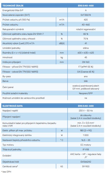 NIBE ERS S40 je rekuperační jednotka s nízkou spotřebou energie, která najde využití jak v novostavbách, tak v rekonstrukcích. Instalace jednotky NIBE ERS S40 se provádí společně s tepelným čerpadlem NIBE země-voda řady "S" nebo s tepelným čerpadlem NIBE vzduch-voda s VVM/SMO řady "S". Společně tvoří kompletní systém vytápění a větrání. Rekuperační jednotku lze snadno ovládat tepelným čerpadlem. NIBE ERS S40 se dodává v levostranném provedení s ohledem na připojení potrubí, ale lze ji přestavět i na pravostrannou verzi.