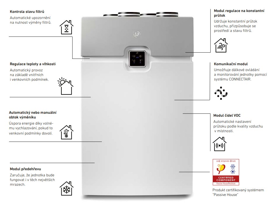 Větrací jednotka určená do bytové výstavby nebo do rodinných domů. Vyznačuje se jednoduchou montáží, minimálními nároky na ovládání a údržbu a velice úsporným provozem. Snadné přepnutí mezi levým a pravým provedením. Všechny jednotky jsou certifikovány systémem „Passive House“.