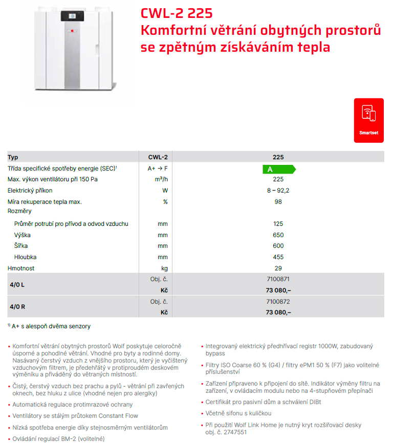 Rekuperační jednotka Wolf CWL-2 225 má účinnost rekuperace tepla až 91 %.