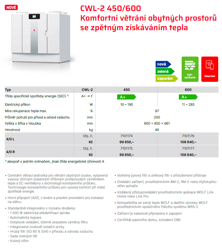Centrální větrací jednotka CWL-2 pracuje díky nejmodernějším technologiím extrémně tiše a velmi nenápadně přivádí do vaší domácnosti čerstvý, filtrovaný vzduch. Mezi všemi větracími jednotkami WOLF vyniká model CWL-2 také mimořádnou efektivitou. 99% účinnost rekuperace tepla znamená nízké náklady na energii a udržitelný provoz. Jednotku CWL-2 od společnosti WOLF nabízíme v pěti výkonových verzích: CWL-2-225, CWL-2-325, CWL-2-400, CWL-2-450 a CWL-2-600.