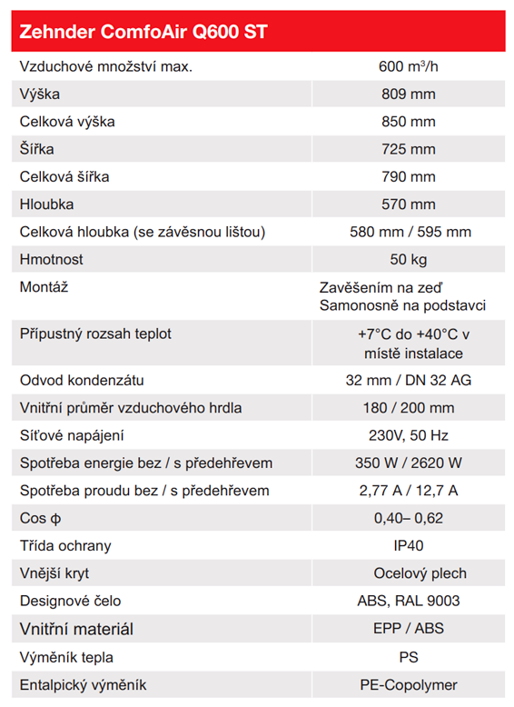Technické údaje - Rekuperace Zehnder ComfoAir Q600