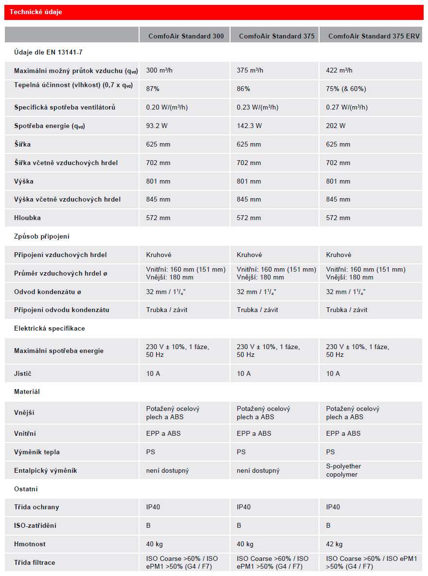 Větrací jednotka Zehnder ComfoAir Standard je navržena jako ideální řešení pro zlepšení kvality bydlení v novostavbách i rekonstruovaných budovách. Díky zpětné kompatibilitě je umožněna snadná inovace již dříve nainstalovaných systémů větrání. Tato jednotka je navržena jako generační náhrada jednotky Zehnder ComfoAir G90. Použita může být také jako náhrada konkurenčních větracích jednotek. Zehnder ComfoAir Standard má výbornou energetickou účinnost, nízkou hladinu akustiky a minimální požadavky na údržbu. To vše za velmi příjemnou cenu. Tato jednotka s moderním designem je dostupná ve dvou výkonových variantách: do 300 m³/h a do 375 m³/h.