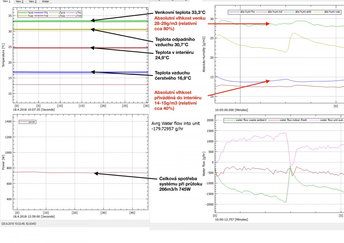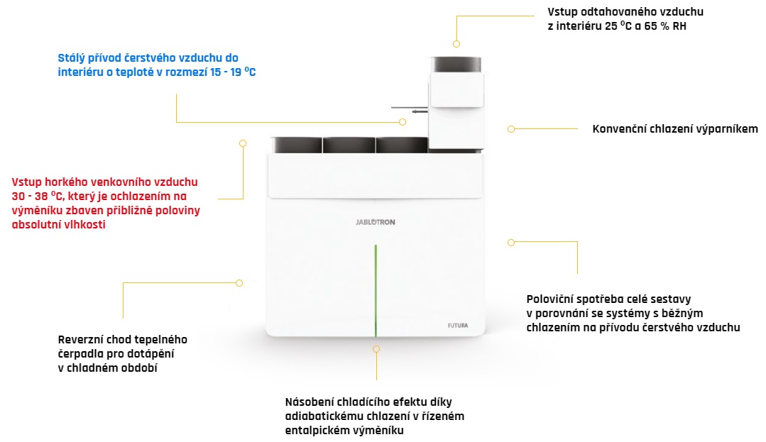 Rekuperační jednotka Jablotron Futura nabízí v zimním období funkci, která jí umožňuje fungovat bez předehřevu a navracet do interiéru vlhkost, která v něm byla vyprodukována. Použitím stejné funkčnosti v letním období je tato jednotka schopna snížit požadavky na výkon chladícího agregátu o polovinu - s dosažením až překvapivých hodnot, jak dokládají následující grafy z testování.
